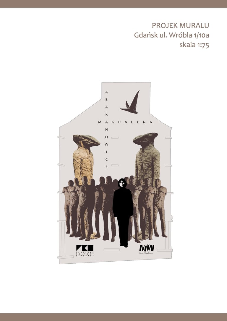 Projekt wykorzystuje charakterystyczny dla artystki motyw kroczących postaci, na których czele stoi sama Abakanowicz – ukazana jako przewodniczka i kreatorka własnych światów. Nad pochodem dominują „Tury” – hybrydy łączące pierwiastek ludzki i zwierzęcy, pełniące rolę niemych obserwatorów przestrzeni. Całość dopełnia ptak z cyklu Uccello oraz przenikające się litery imienia i nazwiska rzeźbiarki. Kolorystyka muralu, oparta na naturalnych barwach ziemi, stanowi nawiązanie do organicznego charakteru jej dzieł.