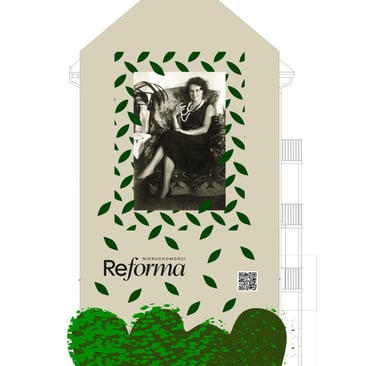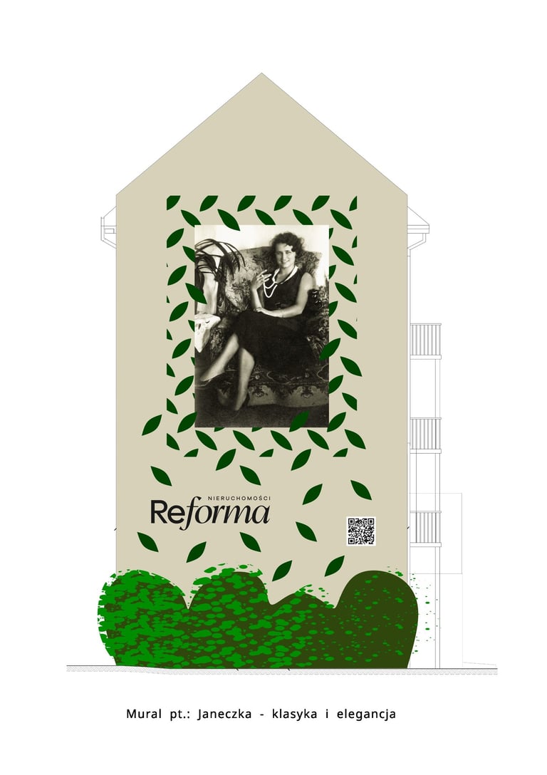 Inspiracją projektu murala jest postać Janiny Niedziałkowskiej, która rodzinnie była powiązana z patronem ulicy Mieczysławem Niedziałkowskim. Zdjęcie pochodzi z okresu międzywojennego i przedstawia piękną kobietę w prostej, a przy tym wytwornej toalecie. Wybierając ten wizerunek chcę zwrócić uwagę na klasyczną elegancję zrewitalizowanej kamienicy oraz nawiązać do postaci Mieczysława Niedziałkowskiego. Zgodnie z zaleceniem konserwatorskim tło murala stanowi naturalny kolor ściany. Natomiast obramowanie zdjęcia stanowią stylizowane zielone liście, które swobodnie opadając przechodzą w naturalną zieleń roślinności zasadzonej wzdłuż ściany budynku. Do projektu wykorzystano zdjęcie pochodzące z własnego archiwum.